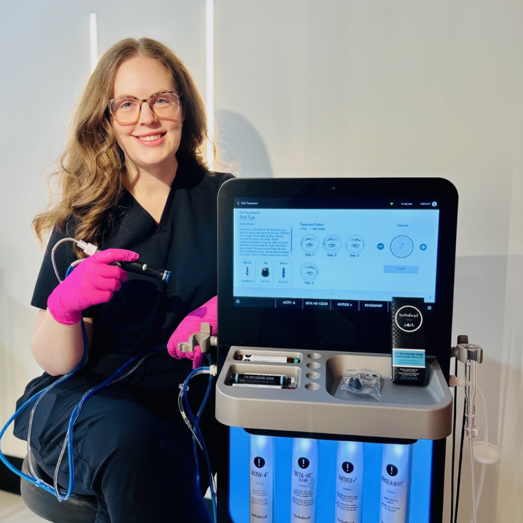 The HydraFacial technique uses patented vortex-fusion technology, combining gentle suction with a spiral tip to exfoliate, extract impurities, and infuse the skin with hydrating serums all in one step